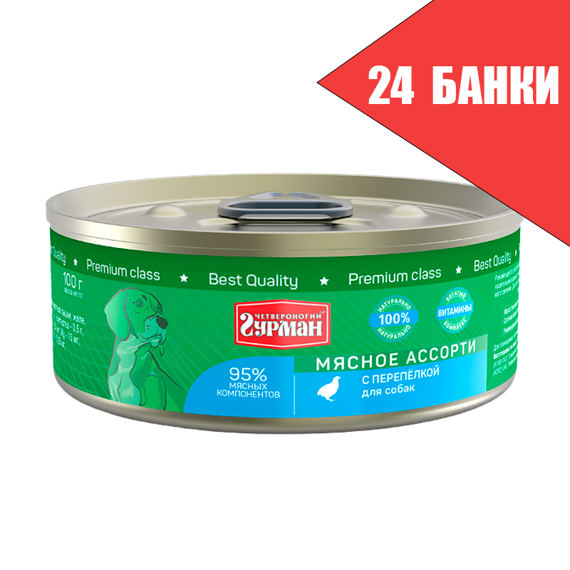 Четвероногий гурман 24шт по 100г Мясное ассорти с перепелкой консервы для собак