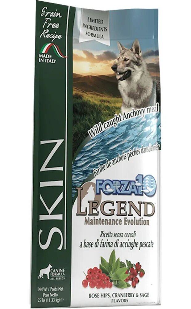 FORZA10 DOG LEGEND SKIN ALL BREEDS беззерновой для взрослых собак всех пород с чувствительной кожей и шерстью с анчоусами (11,33 кг)