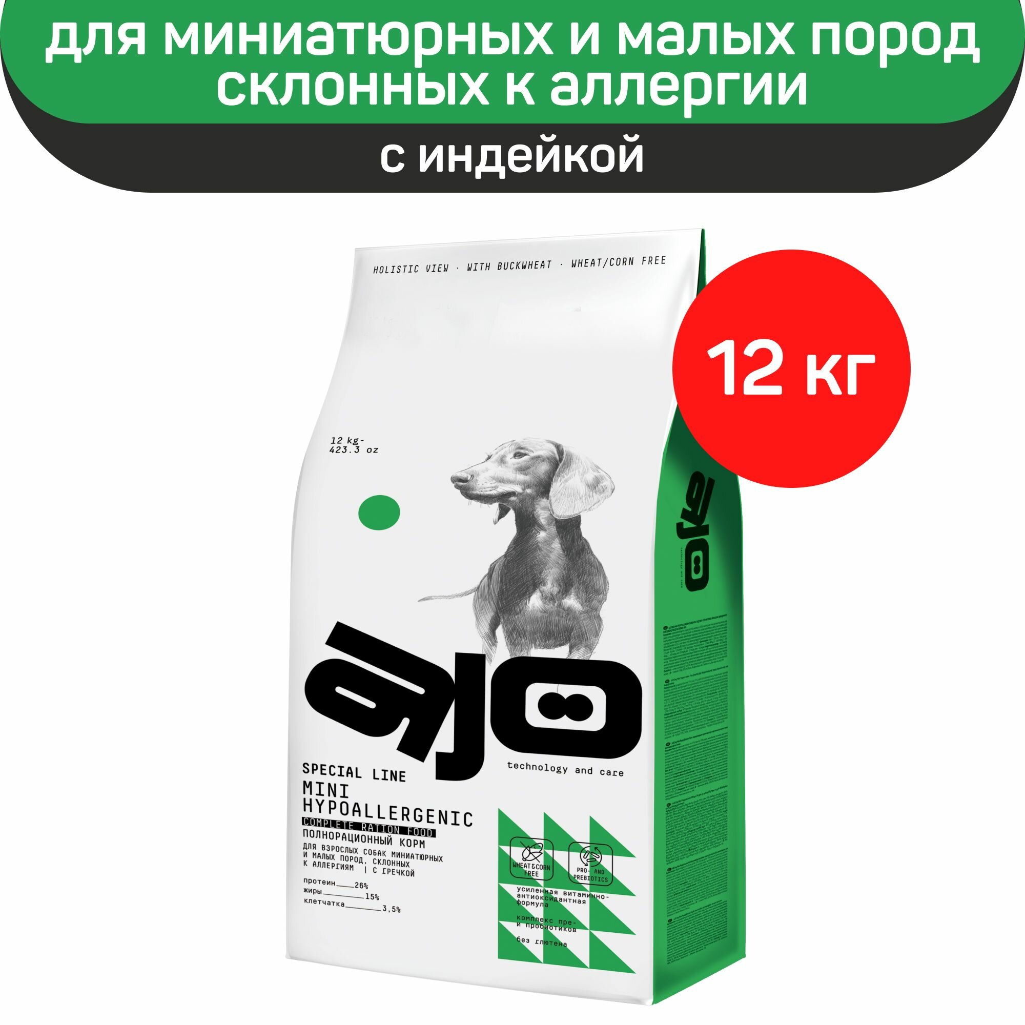 Купить AJO Dog Mini Hypoallergenic Сухой полнорационный корм с гречкой для взрослых собак миниатюрных и малых пород, склонных к аллергиям 12 кг