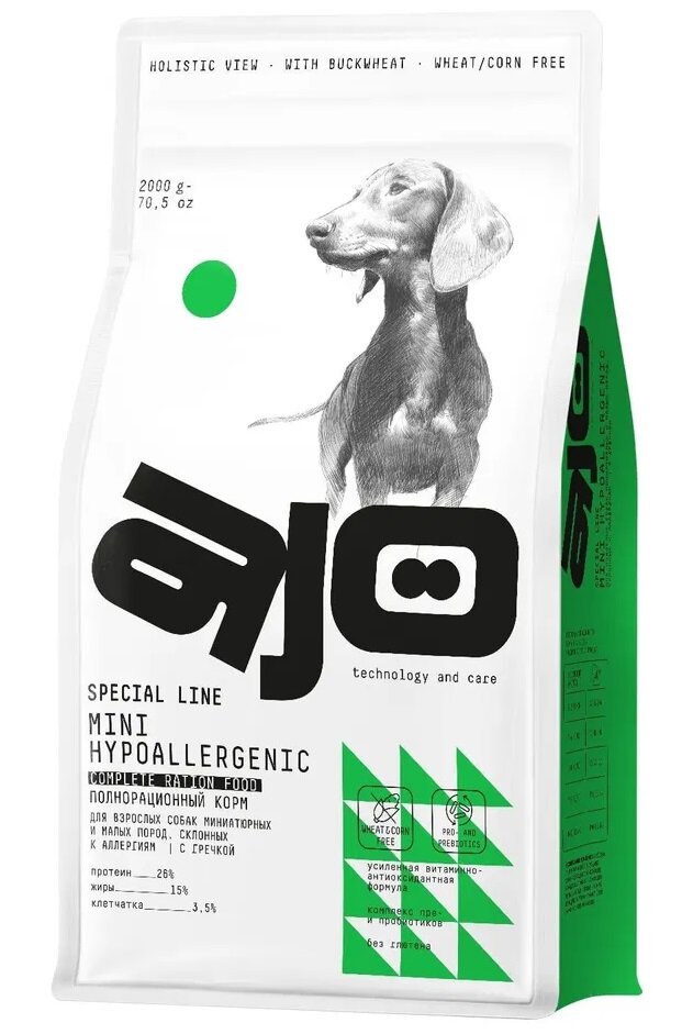 Сухой корм AJO Mini Hypoallergenic с гречкой для взрослых собак миниатюрных и малых пород, склонных к аллергиям 2 кг