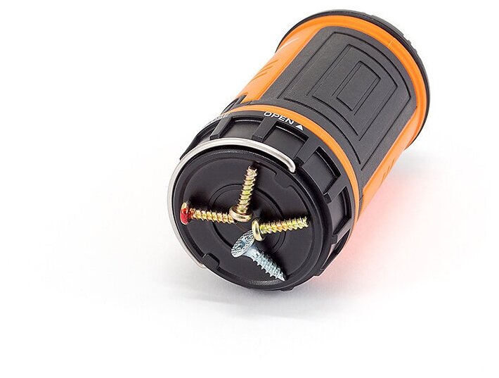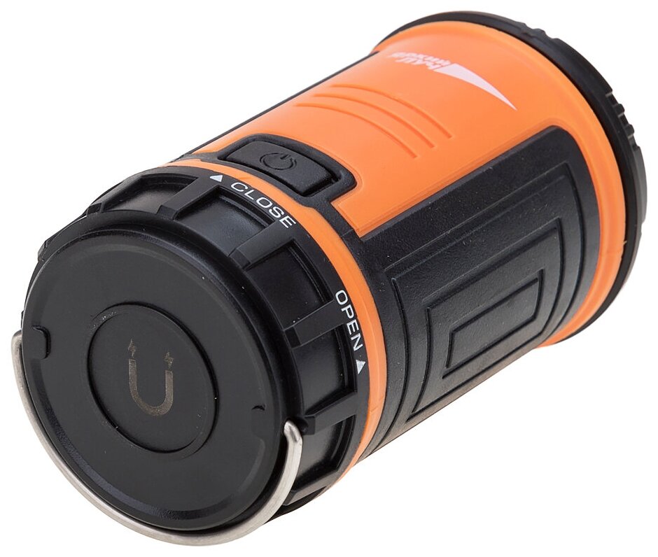 2.3 режима мощности света (низкий - 30%, средний - 50%, высокий - 100%)+мерцающий режим, тоже может пригодится. 4.Яркий, оранжевый цвет, не потеряется в траве и на земле. 5.Использует широко распространённые батарейки типа AA (3 штуки). 6.Есть достаточно мощный магнит и подвес. |