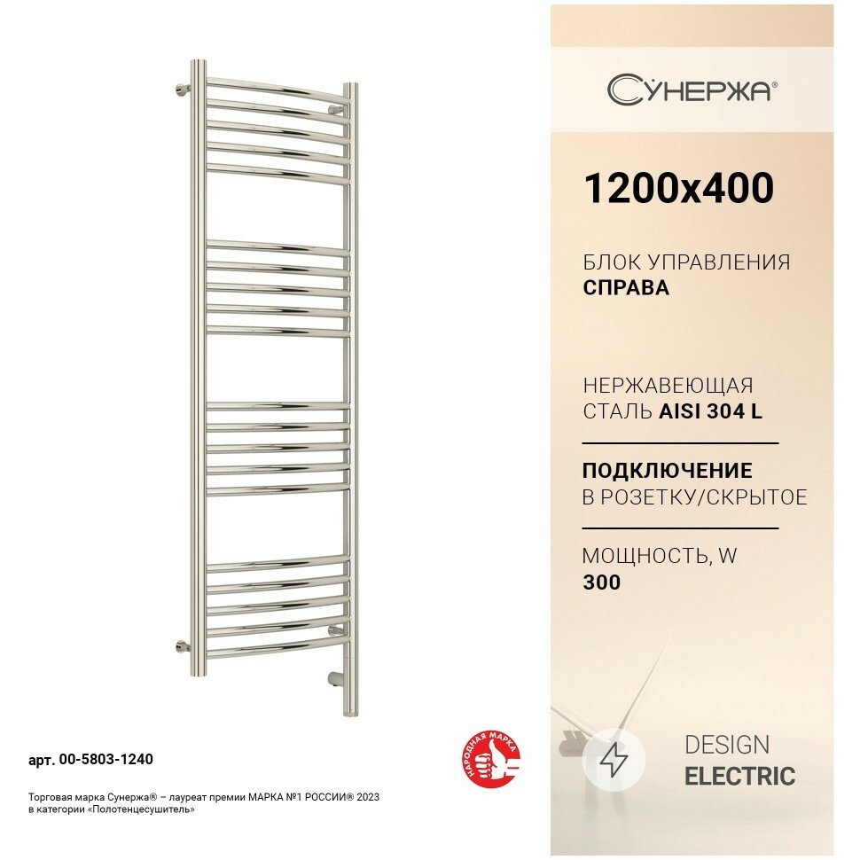 Полотенцесушитель электрический Сунержа Богема 3.0 выгнутая, 1200x400, МЭМ правый, сталь полированная 00-5803-1240