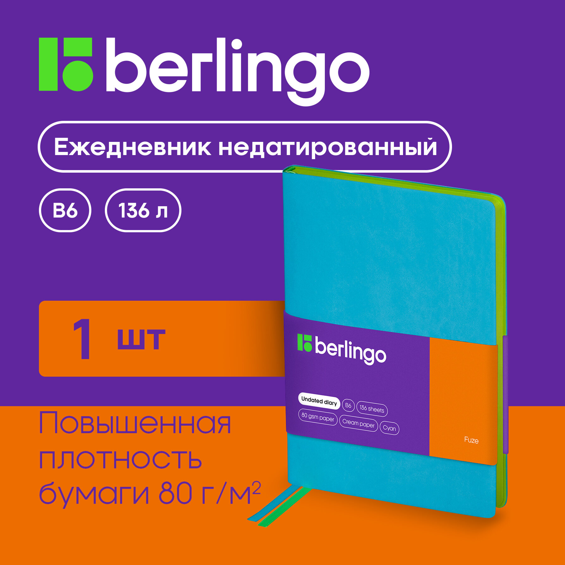 Ежедневник Berlingo Fuze недатированный, искусственная кожа, B6, 136 листов, бирюзовый, цвет бумаги тонированный