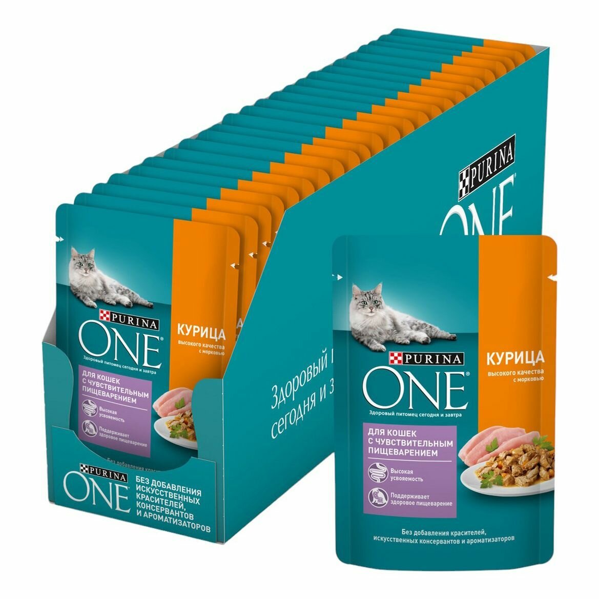 Корм для кошек PURINA ONE с чувствительным пищеварением, курица с морковью пауч 75г (упаковка - 26 шт)
