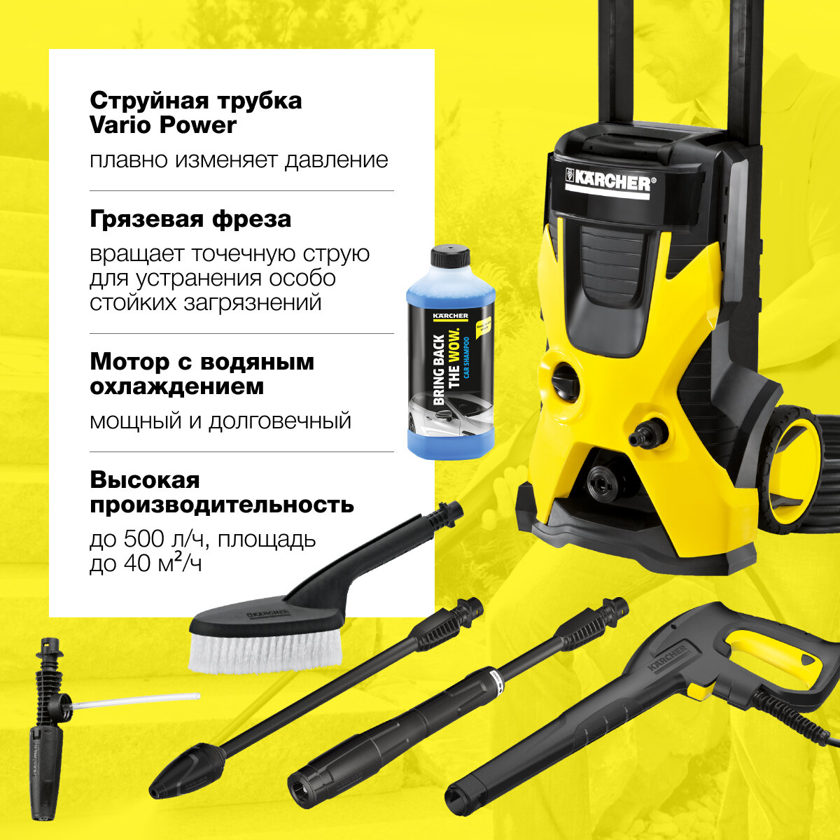 | Насадки | веерная насадка / грязевая фреза / пеногенератор / щетка |