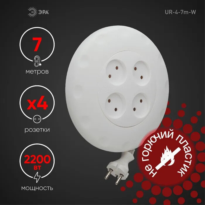 ЭРА UR-4-7M-W Удлинитель сетевой 7м 10А 2200Вт 4 гнезда скручиваемый белый ЭРА