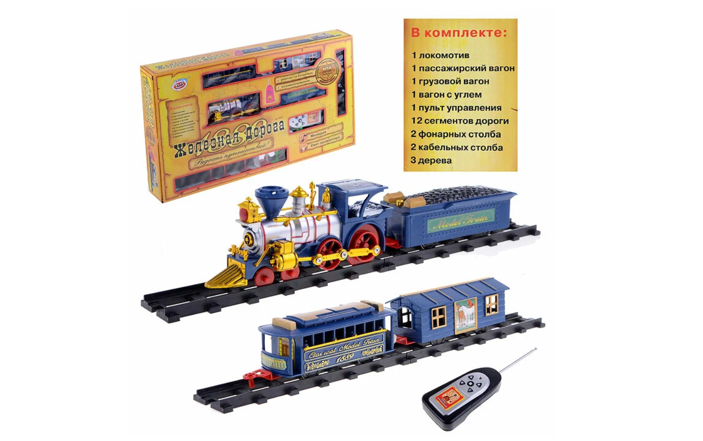 | Дополнительная информация | 1 локомотив (19х8.5х6 см) 1 пассажирский вагон 1 грузовой вагон 1 вагон с углем 1 пульт управления 12 сегметнов дороги 2 фонарных столба 2 кабельных столба 3 дерева Питание игрушки: 4 батарейки 1.5V AA (необходимо докупить отдельно). Питание пульта: 2 батарейки 1.5V AA (необходимо докупить отдельно). |