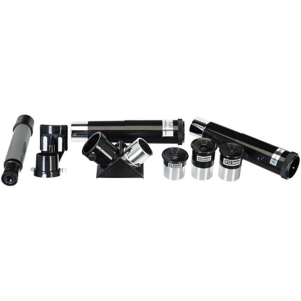 | Комплектация | Оптическая труба телескопа, окуляр SR4 мм, окуляр H12,5 мм, окуляр H20 мм, оборачивающий окуляр 1,5х, линза Барлоу 3х, диагональное зеркало 90°, оптический искатель 5х24, азимутальная монтировка, алюминиевая тренога с полочкой для аксессуаров, инструкция по эксплуатации и гарантийный талон. |