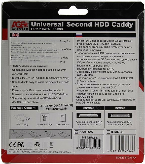 Мобил рек AgeStar Ssmr2s, для замены привода в ноутбуке на 2,5", Sata, black SSMR2S(black) .