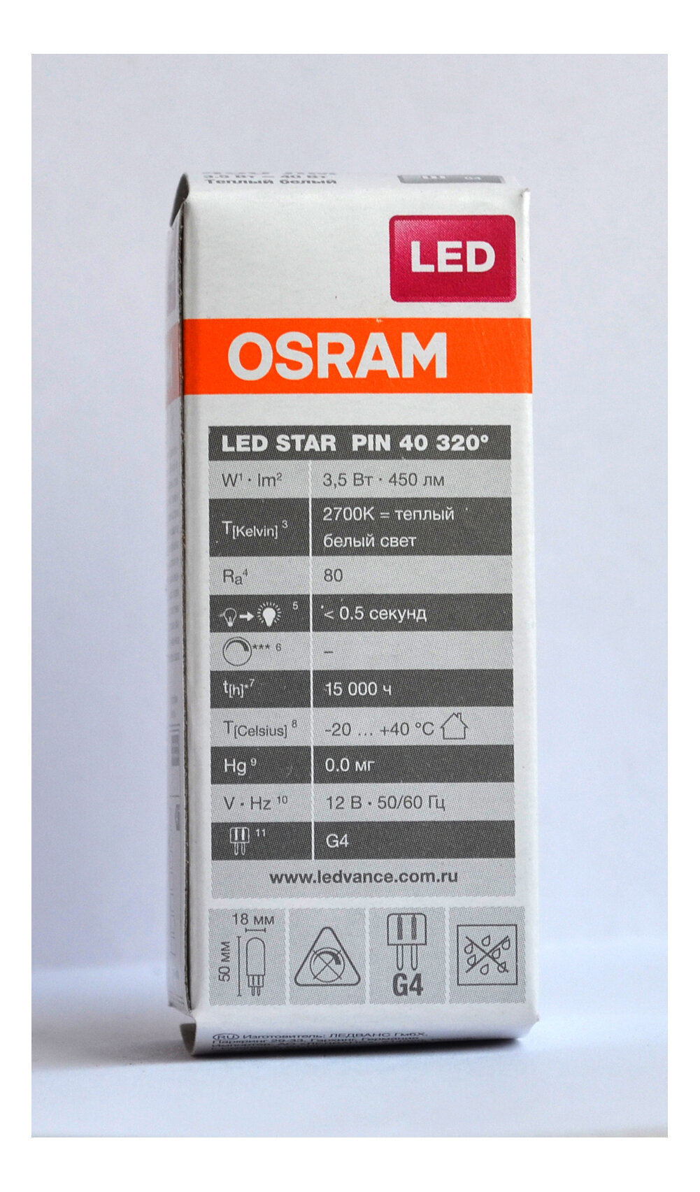 5 шт/уп. Лампа LED Капсула 3.5W 12V G4 PIN 450Лм 2700К Угол 320 град. D-18mm L-50mm Свет Теплый белый OSRAM, уп. 5шт