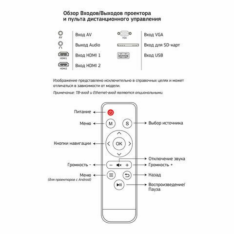 | Разъемы и интерфейсы | USB Type-A / вход HDMI x 2 / вход RGB x 2 / вход аудио RCA / вход аудио mini jack 3.5 mm |