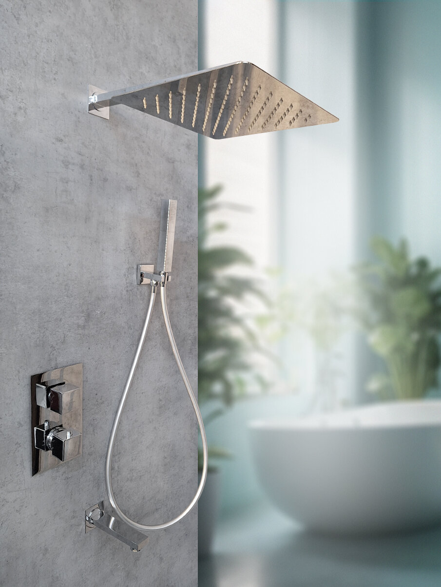 | Комплектация | термостатический смеситель со встраиваемым механизмом / излив / латунный двухрежимный ручной душ / гибкий полимерный шланг / верхний душ |