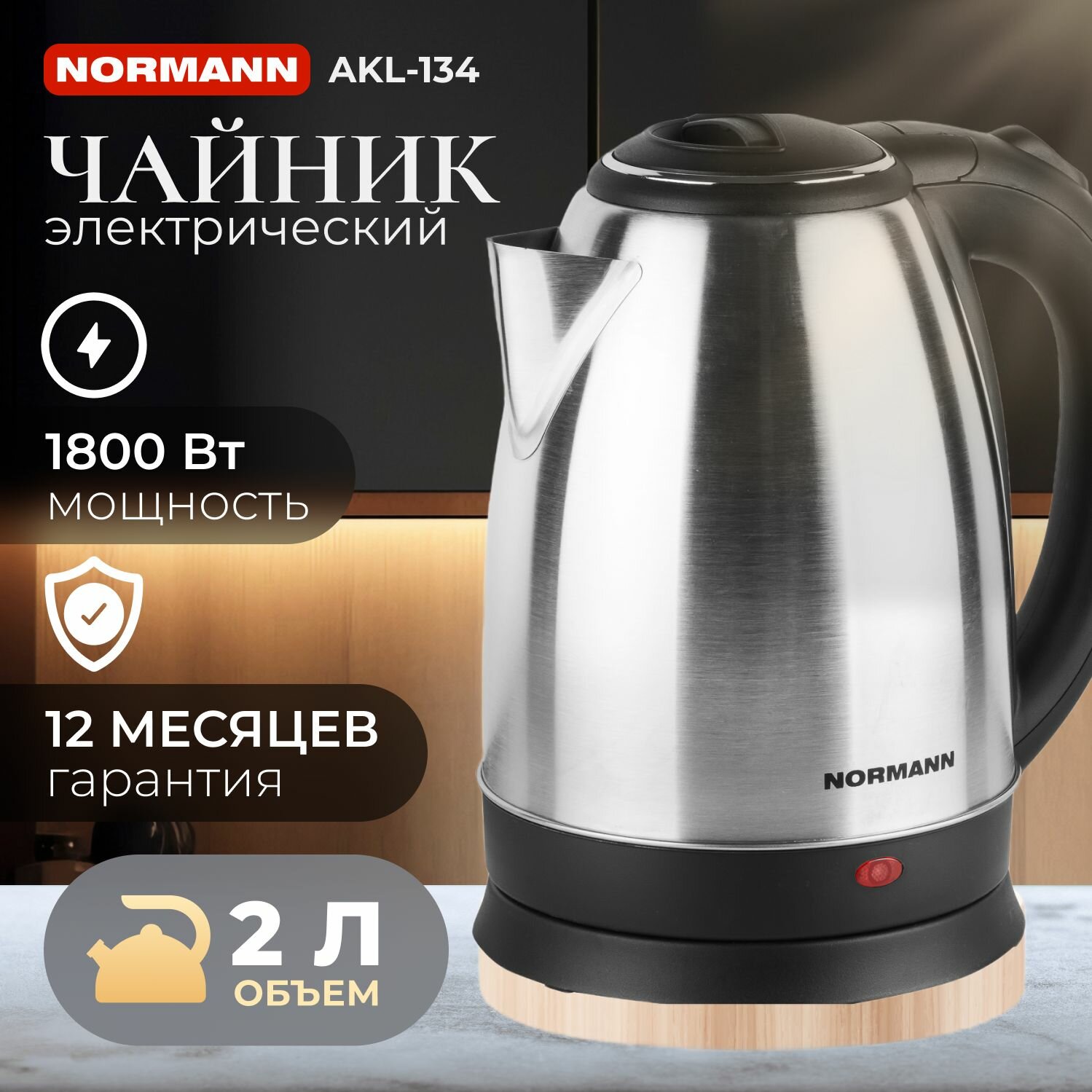 Чайник электрический (электрочайник) NORMANN AKL-134 1800 Вт, 2 литра, нержавеющая сталь