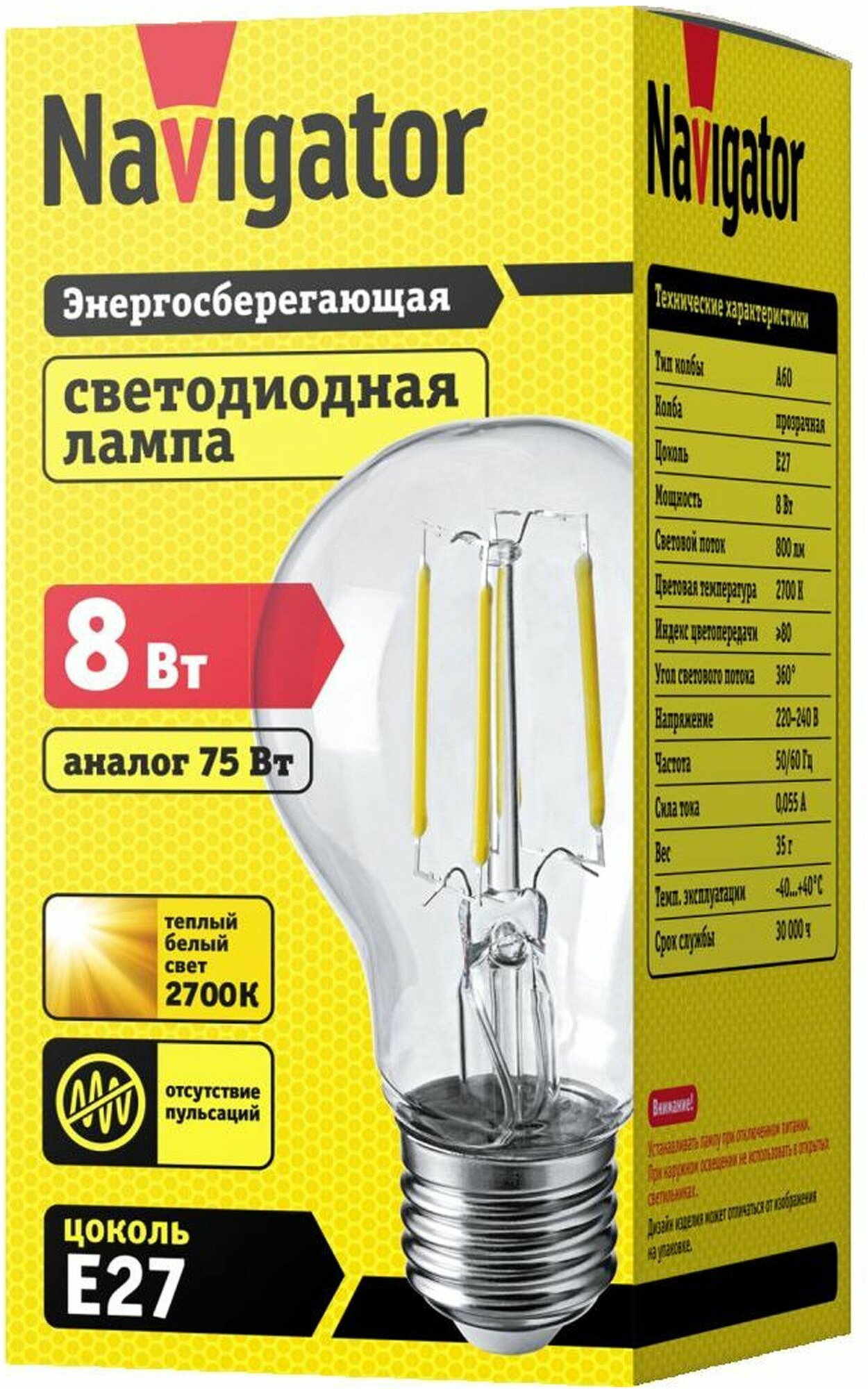 Лампа светодиодная Navigator E27 2700К 8 Вт 800 Лм 220 В груша A60 прозрачная