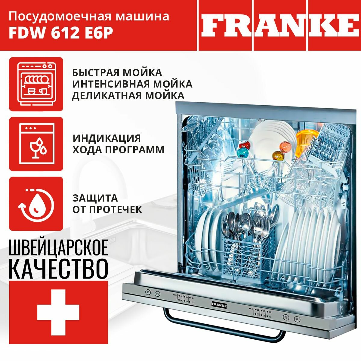 Franke Посудомоечная машина Franke FDW 612 E6P A++/ Good, Встраиваемая FDW 612 E6P A++, 60 см, 12 комплектов посуды, 6 программ, Две корзины, Половинная загрузка, Отсрочка старта, Аквастоп, A++