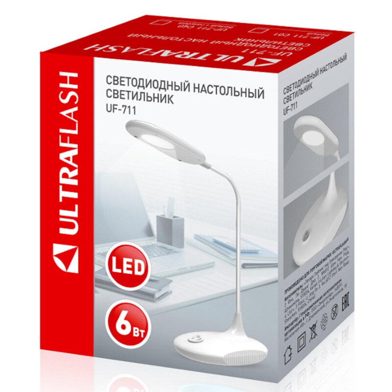 Ultraflash UF-711 C01 св-к св/д настольный 6W(280lm) 6000K 6K пластик/белый