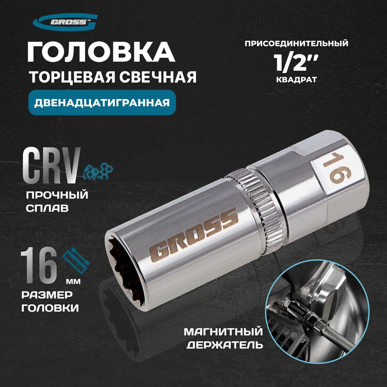 Головка торцевая свечная, магнитная, двенадцатигранная, 16 мм, под квадрат 1/2 Gross