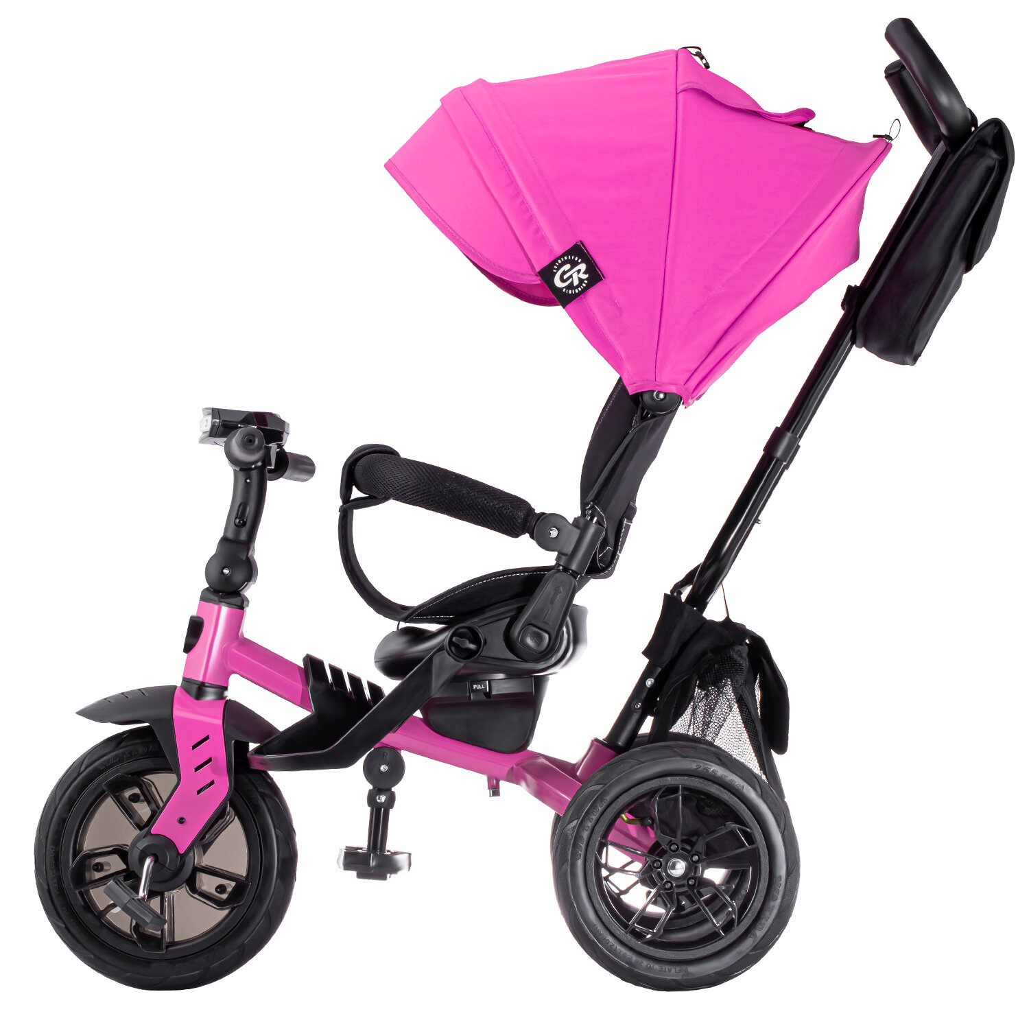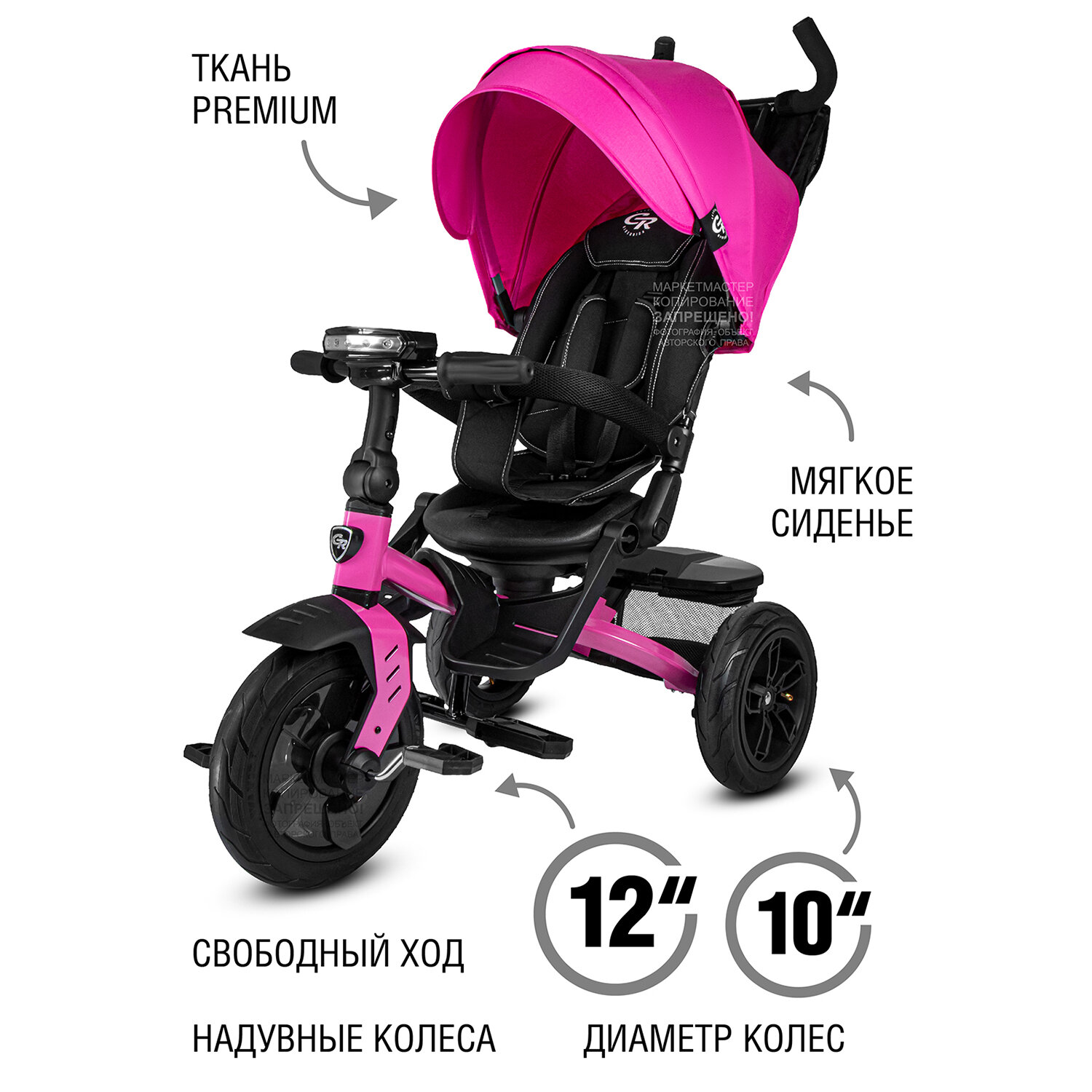 Велосипел детский трехколесный ТМ "CITY-RIDE LUNAR". Пятиугольная рама, складная крыша D600, фара свет/звук, подножки, надувные колеса 12"/10", ножной тормоз, поворот сиденья на 360гр. Цвет розовый