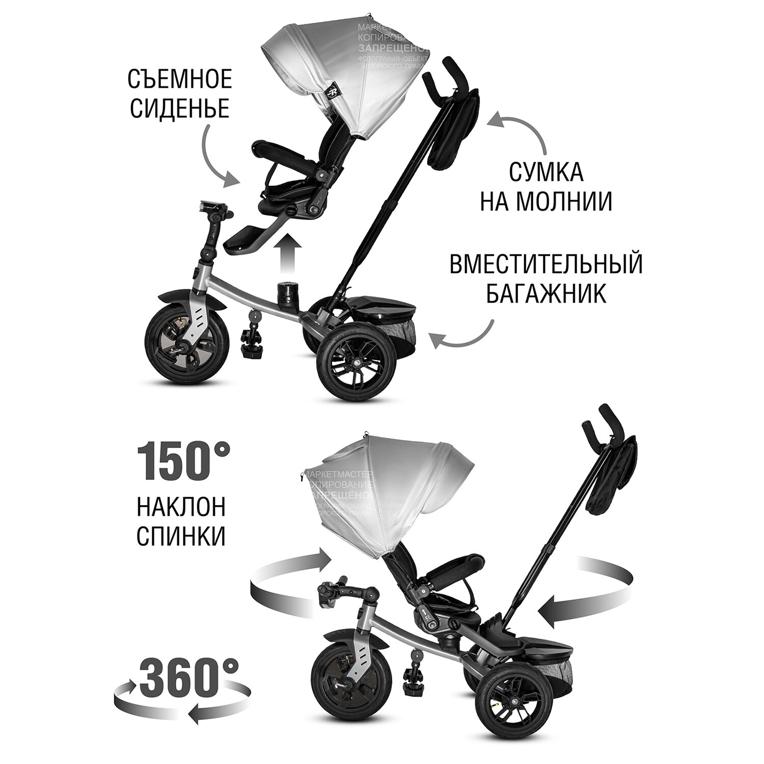 | Дополнительная информация | багажник - комплектация возможна в 2 х вариантах: с корзиной для хранения игрушек или с мягким рюкзачком, поворотное сиденье 360 градусов: лицом к маме и лицом по ходу движения, сиденье разворачивается 2-мя кнопками, 3 угла наклона спинки, максимальный наклон - 150 градусов; родительская ручка управления регулируется по высоте, руль складной |