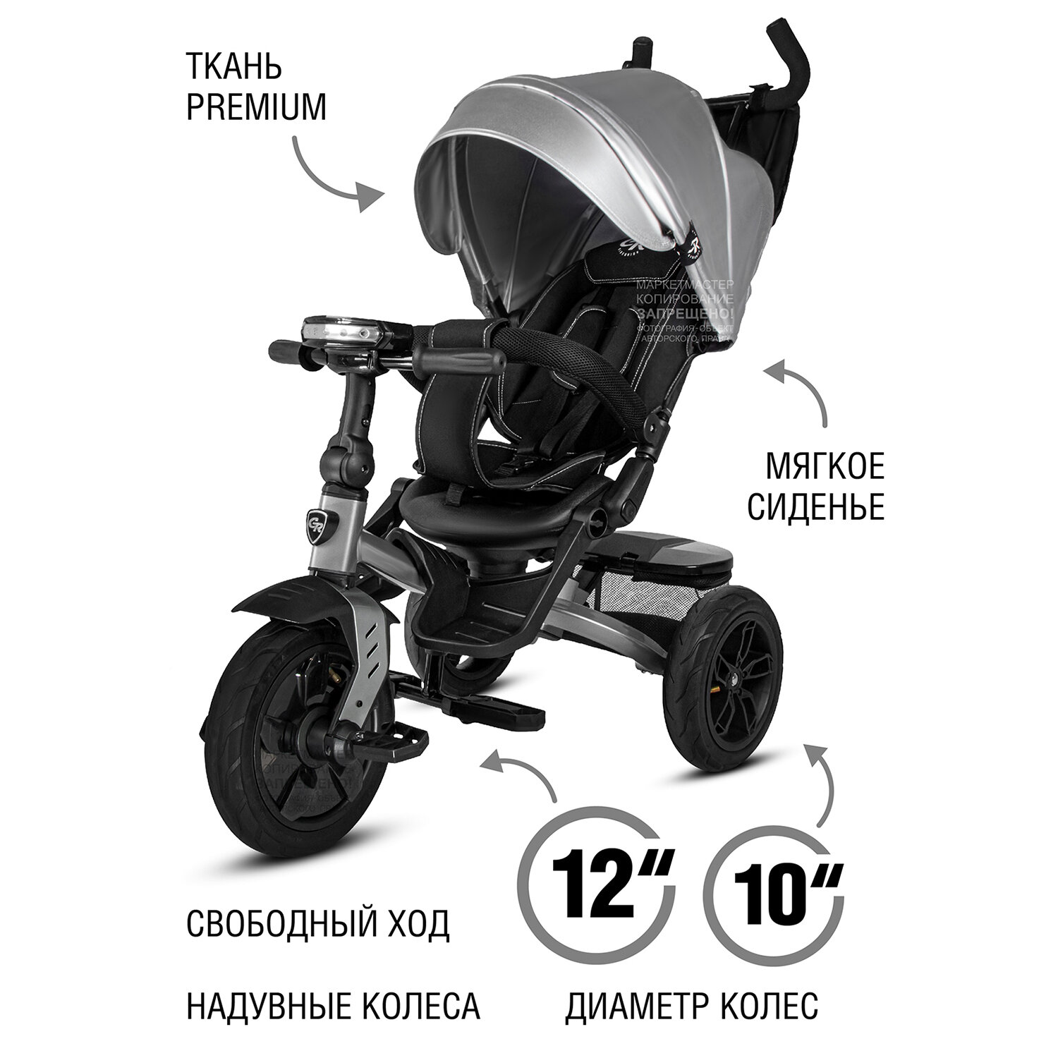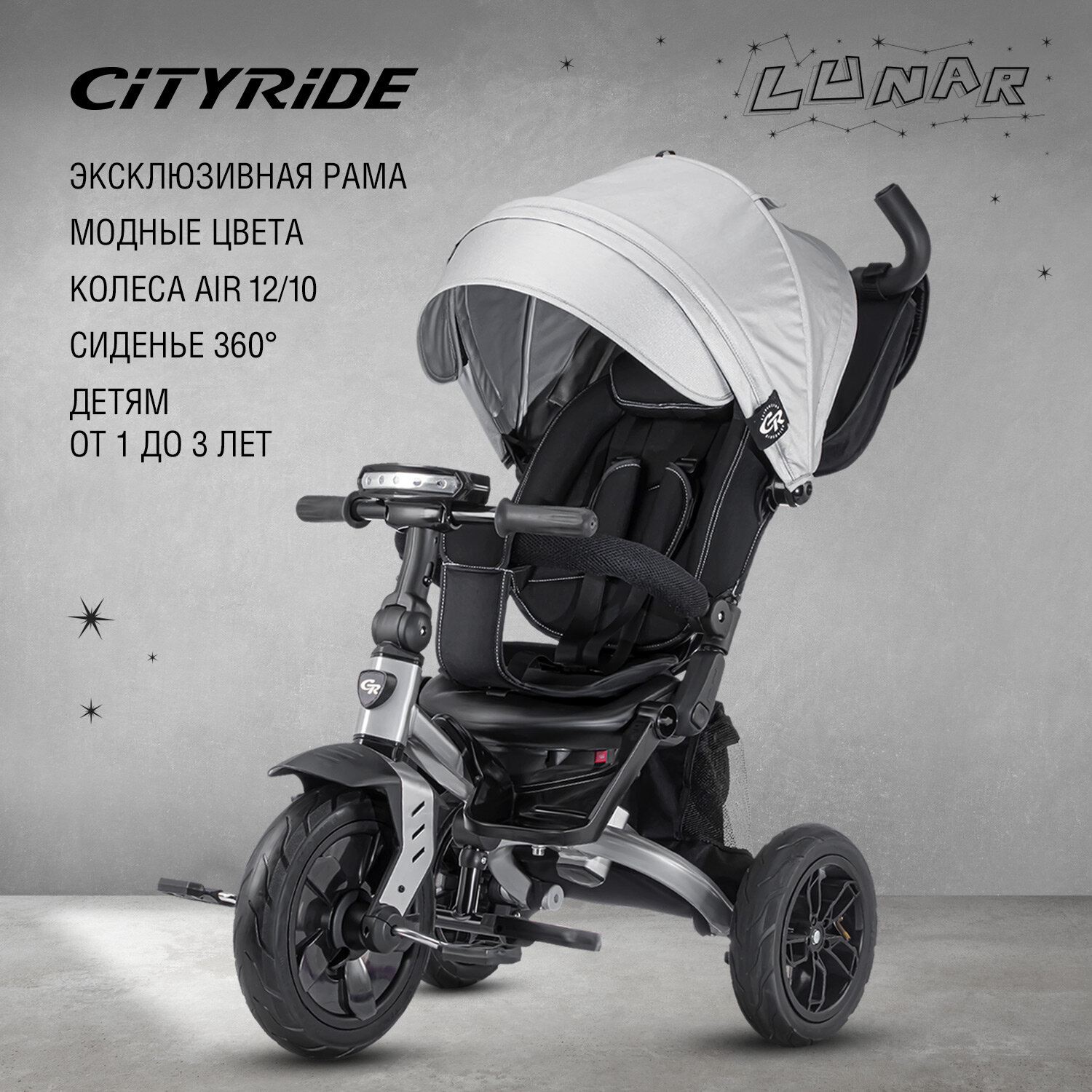 Купить Велосипед детский 3-колесный ТМ CITYRIDE LUNAR, складная крыша, надувные колеса 12"/10", ножной тормоз, поворот сиденья 360◦, свет/звук, CR-B3-10GY