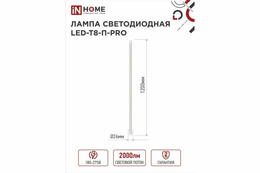 Лампа светодиодная LED-T8-П-PRO 20Вт 6500К G13 1620лм 230В 1200мм прозр. IN HOME 4690612031002