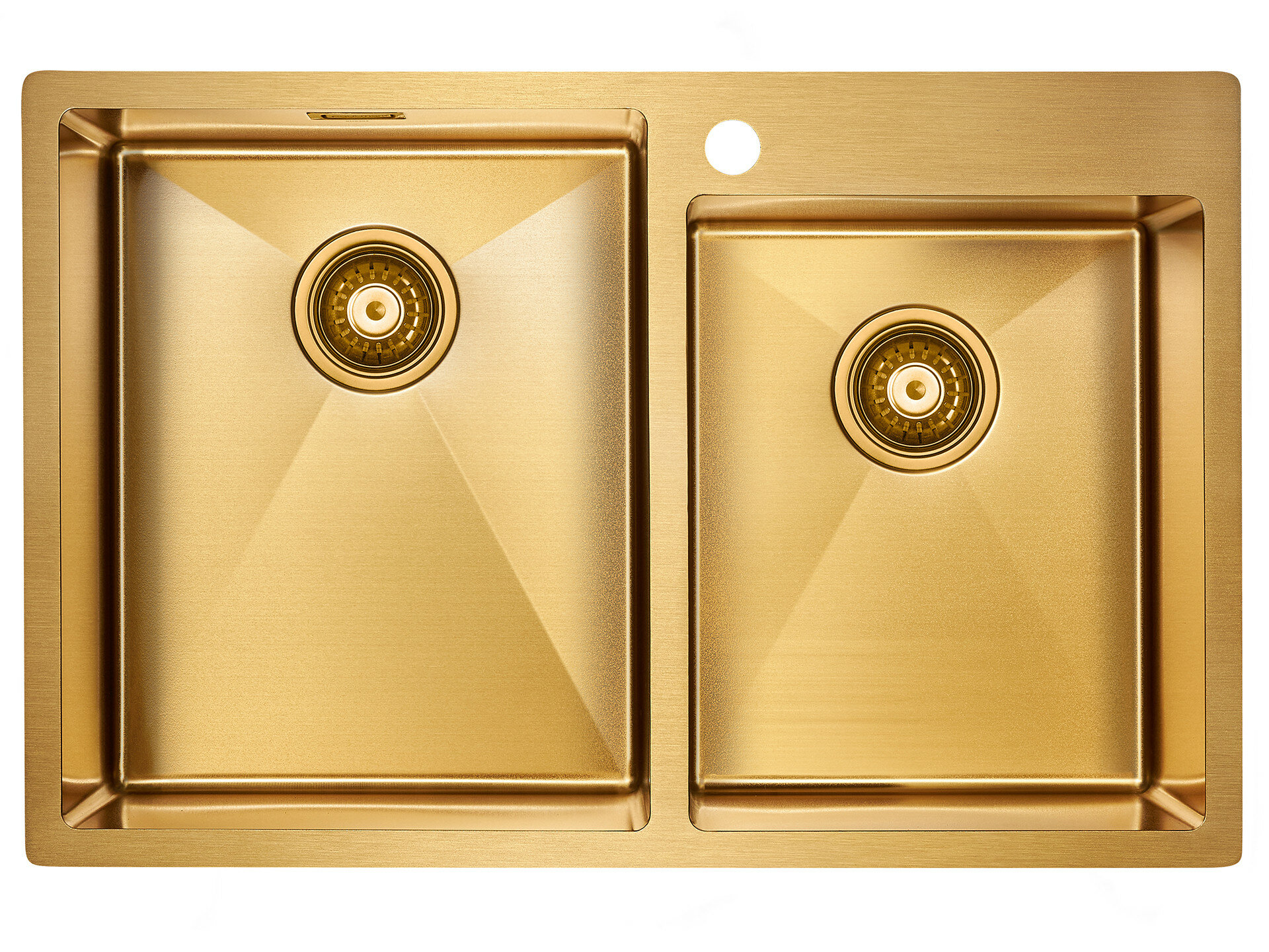 Купить Мойка для кухни из нержавеющей стали AISI 304 Paulmark BERMAN, 780х510 мм, PVD покрытие, универсальный монтаж, шумопоглащающее покрытие, две чаши, цвет брашированное золото, PM517851-BG