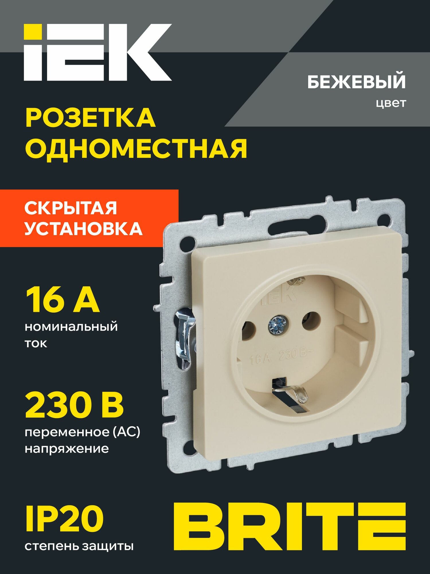 BRITE Розетка с заземлением с защитными шторками 16А РС14-1-0-БрКр бежевый , IEK BR-R14-16-K10 (1 шт.)