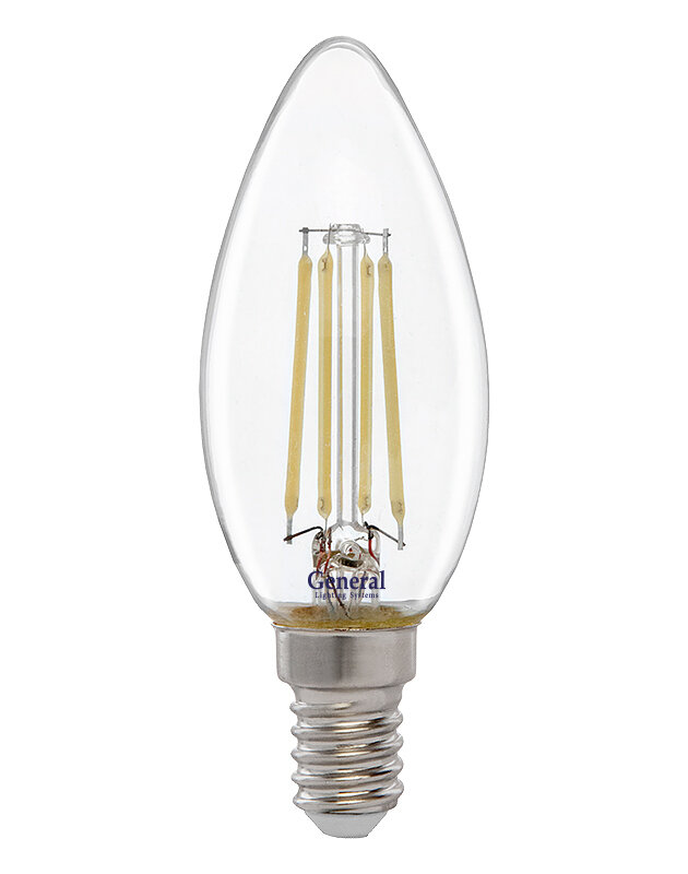 (6 шт.) Светодиодная лампочка General свеча E14 8W 2700K 2K 35x98 филамент (нитевидная), прозр 649971 Теплый белый. Цоколь E14