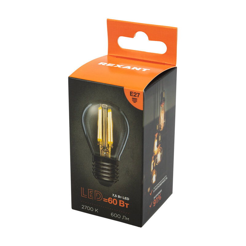 Лампа филаментная Rexant Шарик GL45, 7,5 Вт, 2700 К, Е27, теплый свет