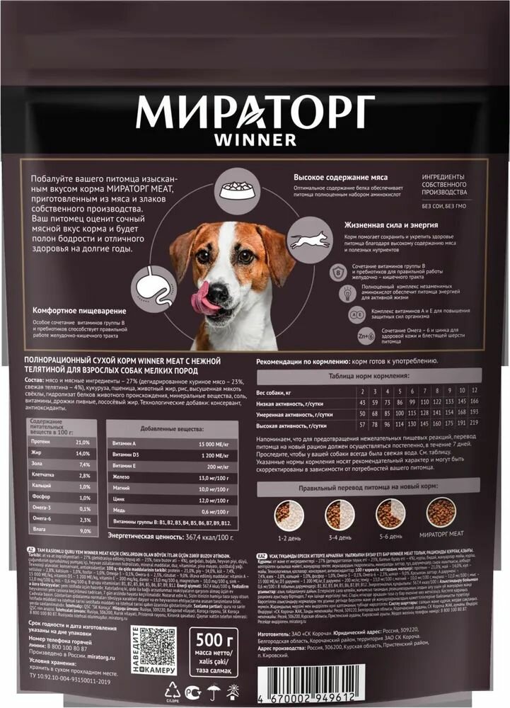 Корм сухой Мираторг MEAT 500гр х 1шт для собак маленьких пород с телятиной. Виннер