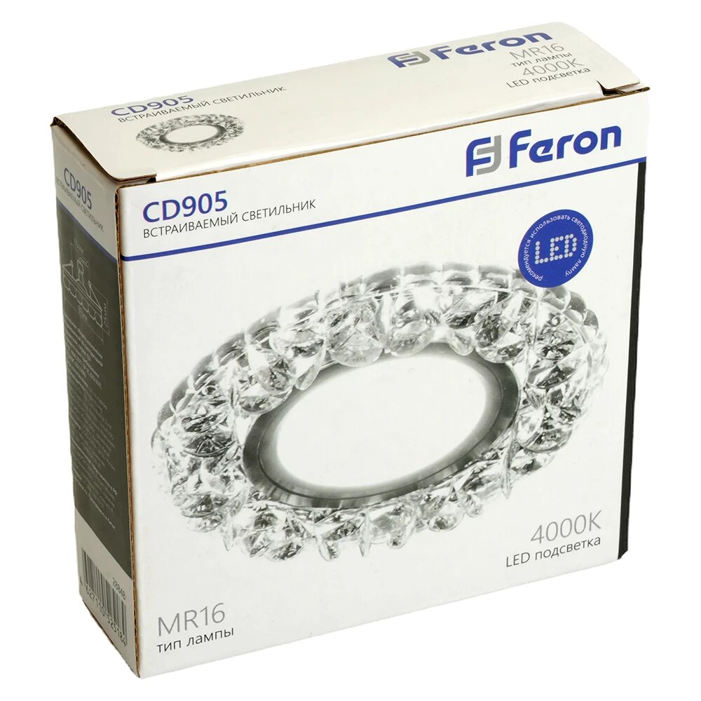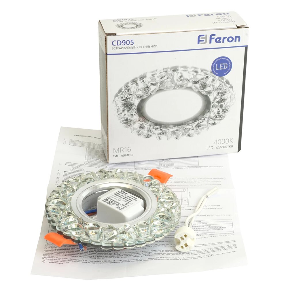 Светильник Feron Светильник встраиваемый с подсветкой 4000K, MR16 50W G5.3, белый, хром, CD905 Feron, 28848, G5.3, 50 Вт, 4000, холодный белый, цвет арматуры: хром, цвет плафона: бесцветный, 50 шт.