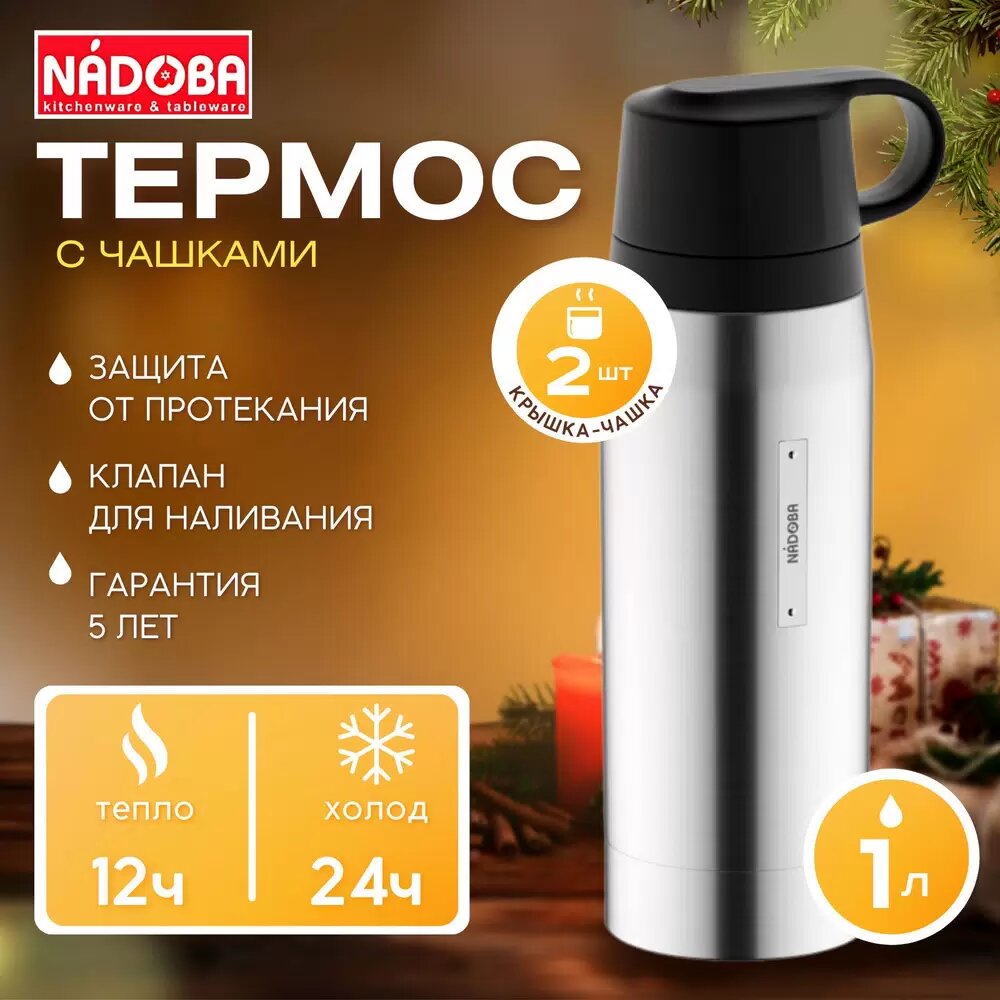 Термос с 2 чашками NADOBA, STELA, объем 1 л, сохраняет температуру 24 часа