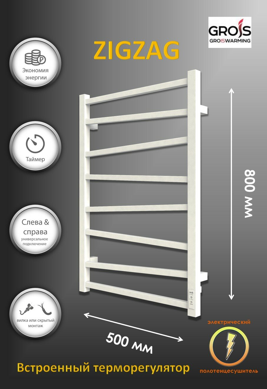Электрический полотенцесушитель Grois ZIGZAG GR-103 500х800 П8 RAL9016 белый матовый