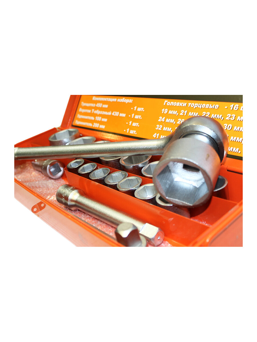 | Головки торцевые подробно | 3/4": 16, 19, 21, 22, 23, 24, 26, 27, 30, 32, 34, 36, 38, 41, 46, 48, 50 мм; удлинитель 3/4": 100, 200 мм; вороток т-образный 3/4": 430 мм; трещотка 3/4" |