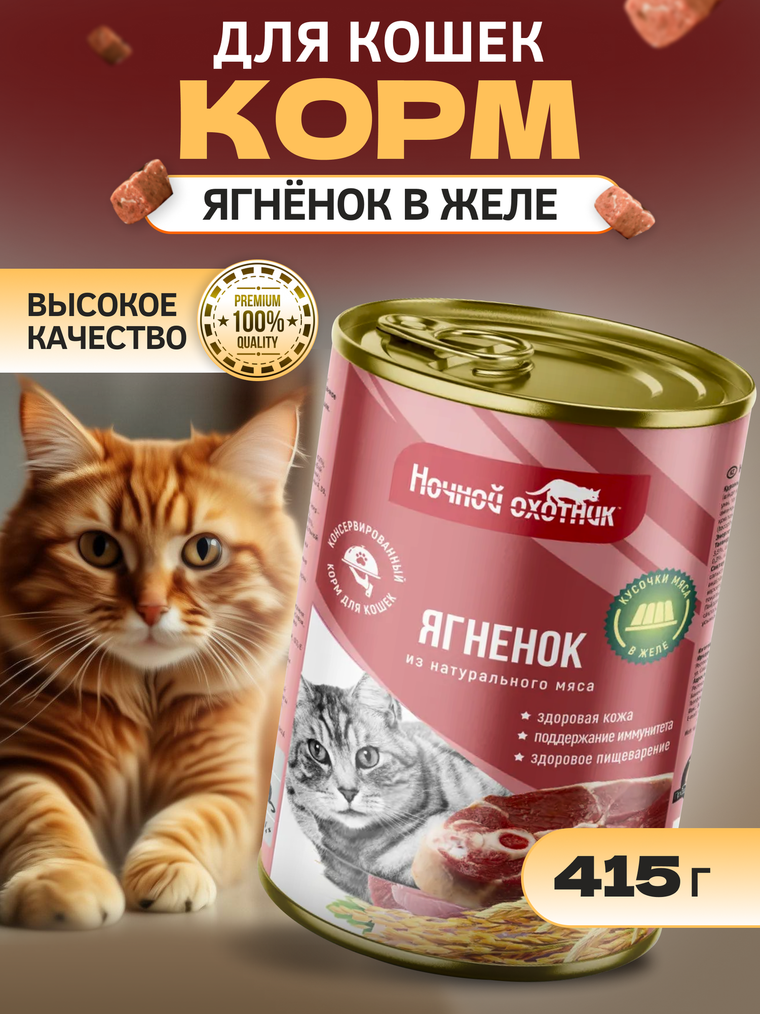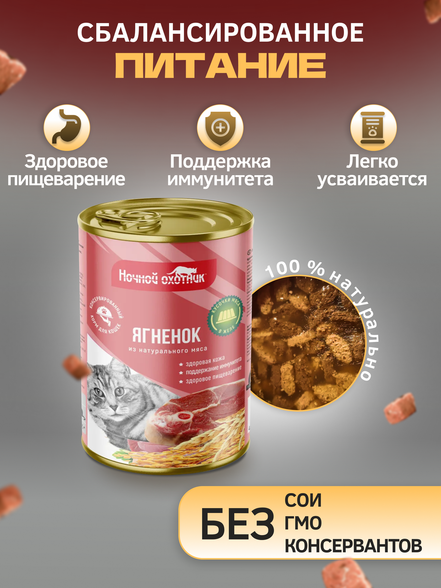 Корм для кошек влажный Ночной Охотник для взрослых животных, кусочки мяса ягненка в желе, 415г / консервы