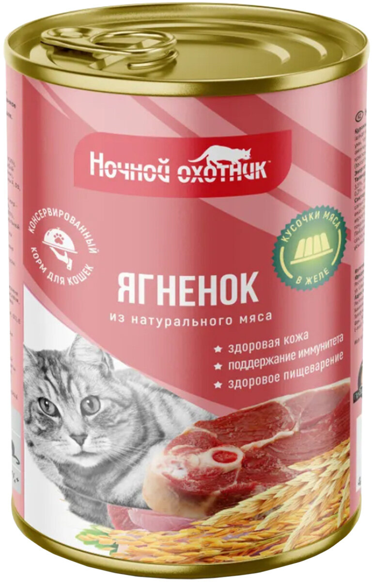 Ночной охотник влажный корм для взрослых кошек всех пород, ягненок, кусочки в желе 400 гр (10 шт)