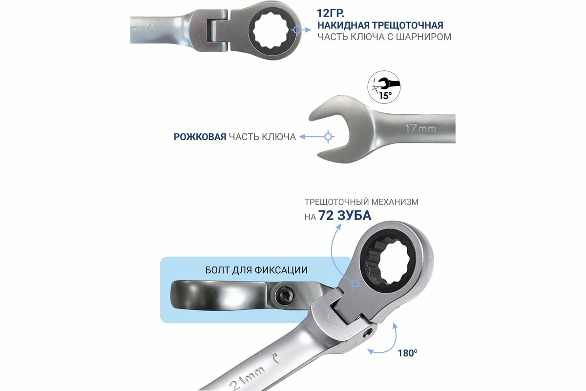 | Гаечные ключи подробно | комбинированные трещоточные ключи с шарниром: 8, 10, 12, 13, 14, 16, 17, 18, 19 мм |