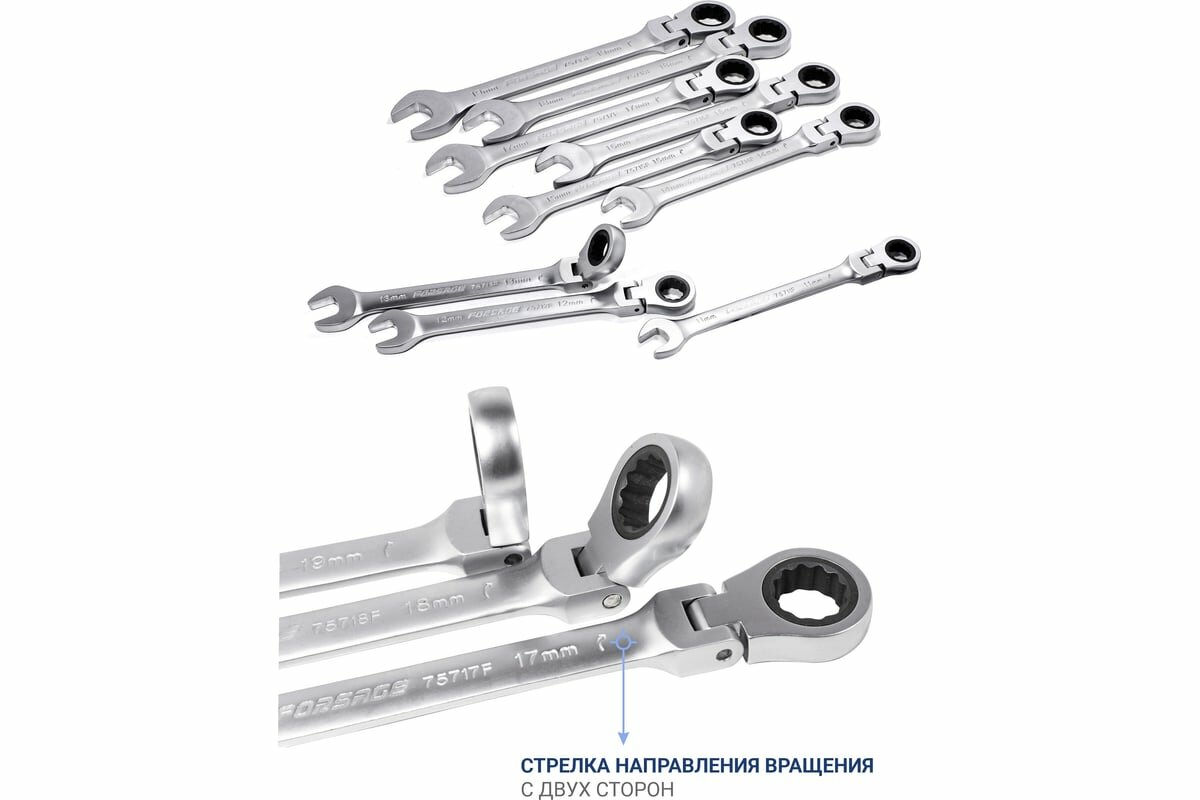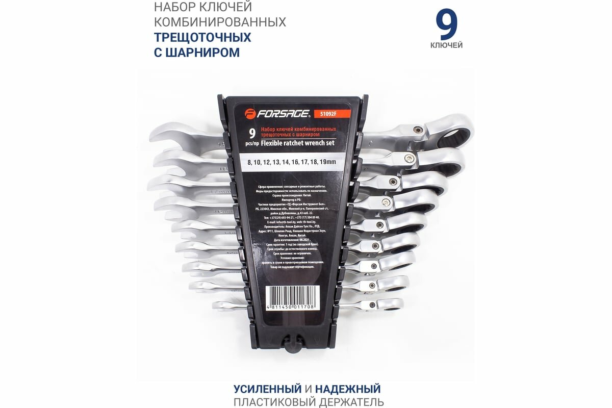 Набор ключей комбинированных трещоточных с шарниром, 9 пр: 8, 10, 12, 13, 14, 16, 17, 18, 19 мм, в, FORSAGE F51092F (1 шт.)