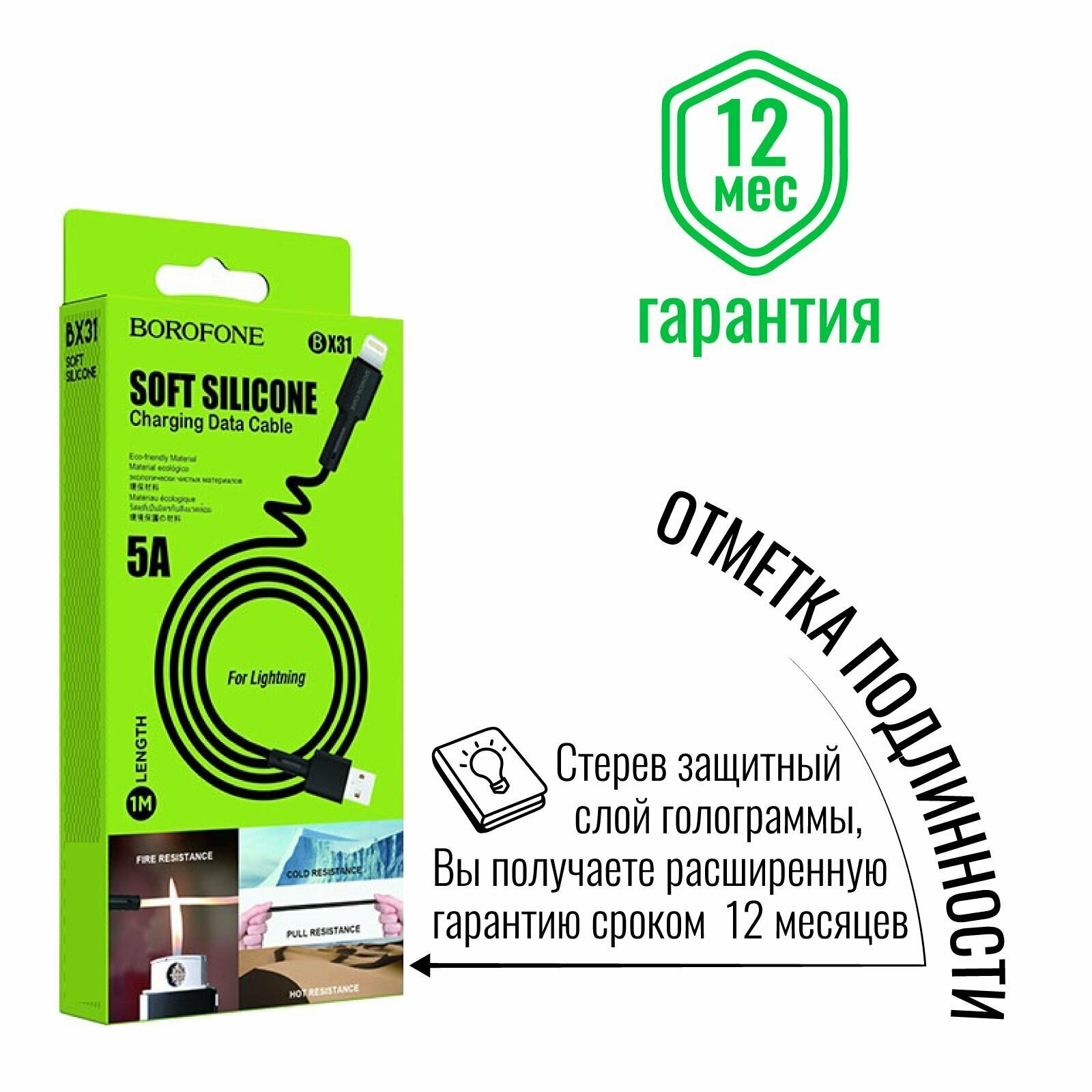 Кабель USB BOROFONE BX31 Silicone USB - Lightning, 5A, 1 м, белый