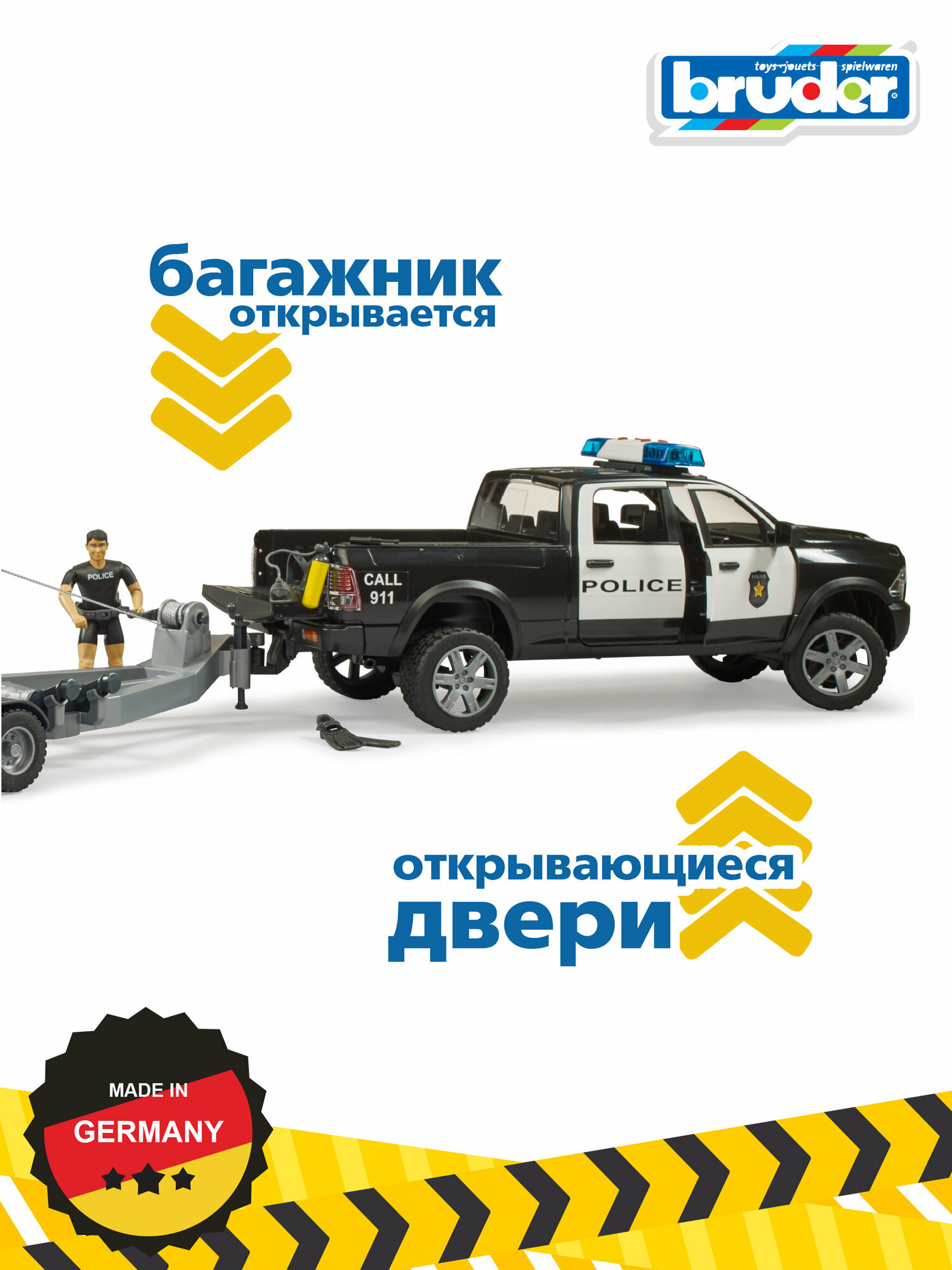 Полицейский пикап Bruder Dodge RAM 2500 с прицепом лодкой и фигурками 02507