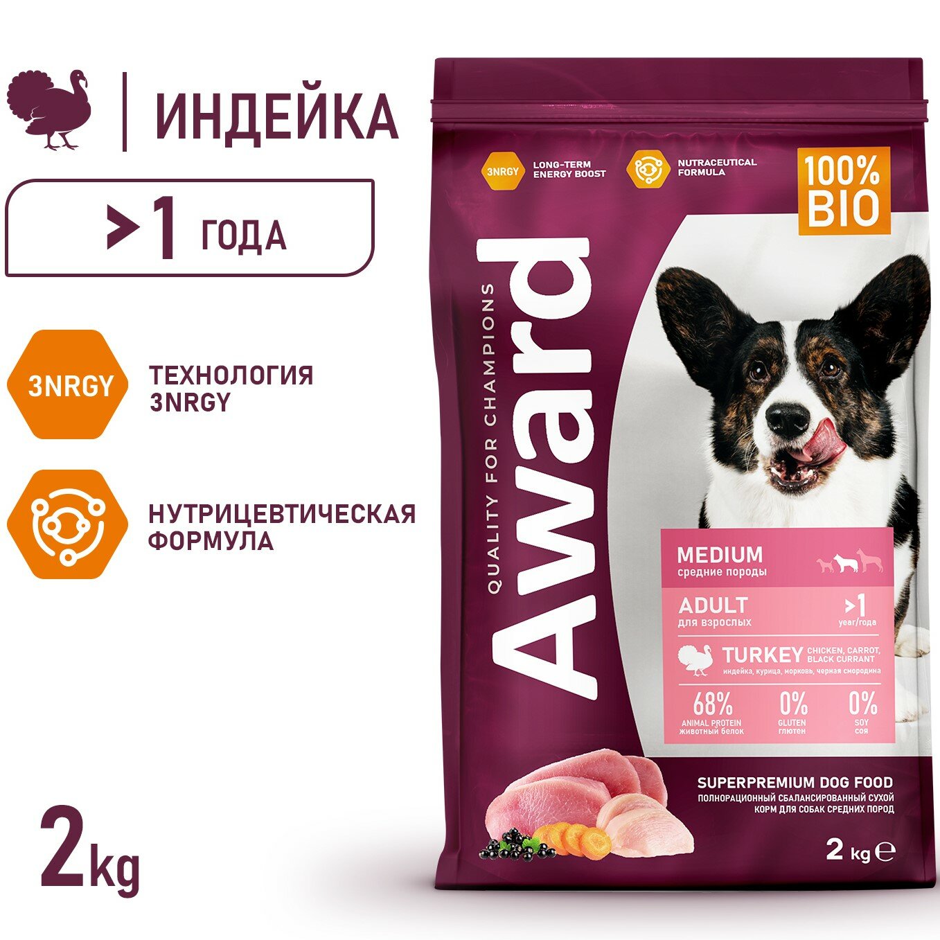 Сухой корм AWARD для взрослых собак средних пород с индейкой и курицей с добавлением моркови и черной смородины 2кг х 2 шт.