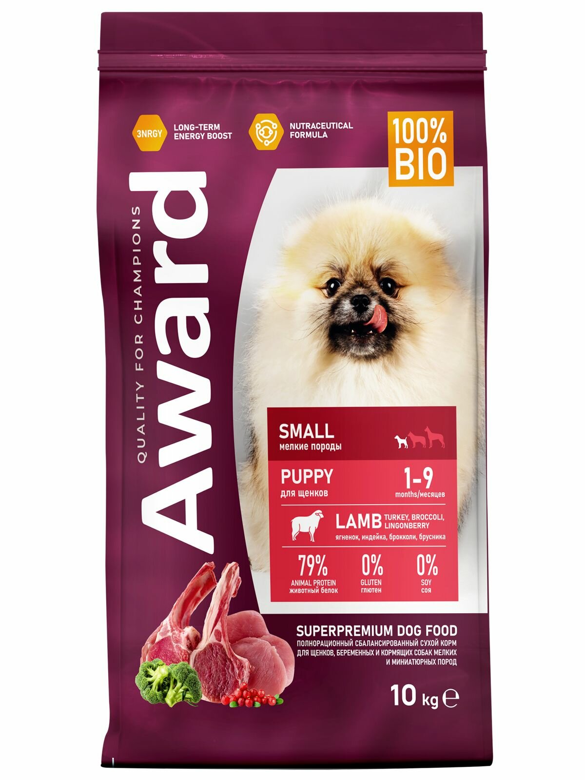 Сухой корм 10 кг с индейкой и ягненком AWARD для щенков от 1 месяца, беременных и кормящих сук мелких и пород, 1 упаковка