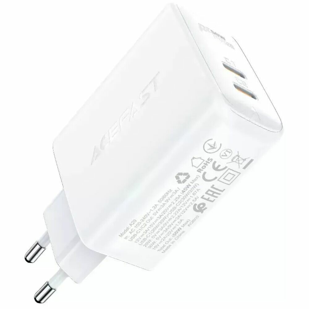 Сетевое зарядное устройство ACEFAST A29 GaN PD50W (2xUSB-C) Fast Charge Wall Charger белое (EU)