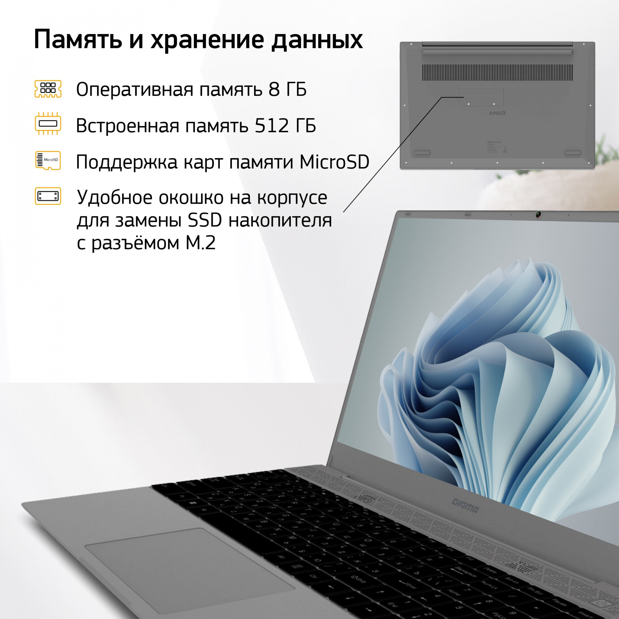 Ноутбук Digma EVE 15 C423, 15.6", IPS, AMD Ryzen 5 3500U 2.1ГГц, 4-ядерный, 8ГБ DDR4, 512ГБ SSD, AMD Radeon Vega 8, Windows 11 Professional, серый космос NR5158DXW01