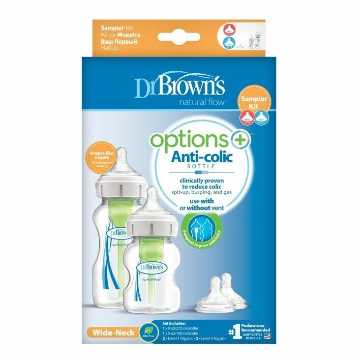 Набор бутылочек антиколик Dr. Brown's Пробный Options+ с широким горлышком 270 мл, 150 мл, соски от 3-х мес