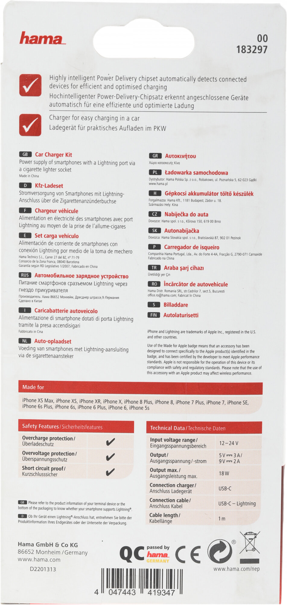 Зарядное устройство Hama автомобильное, H-183297 для Apple кабель Apple Lightning/Type-C белый