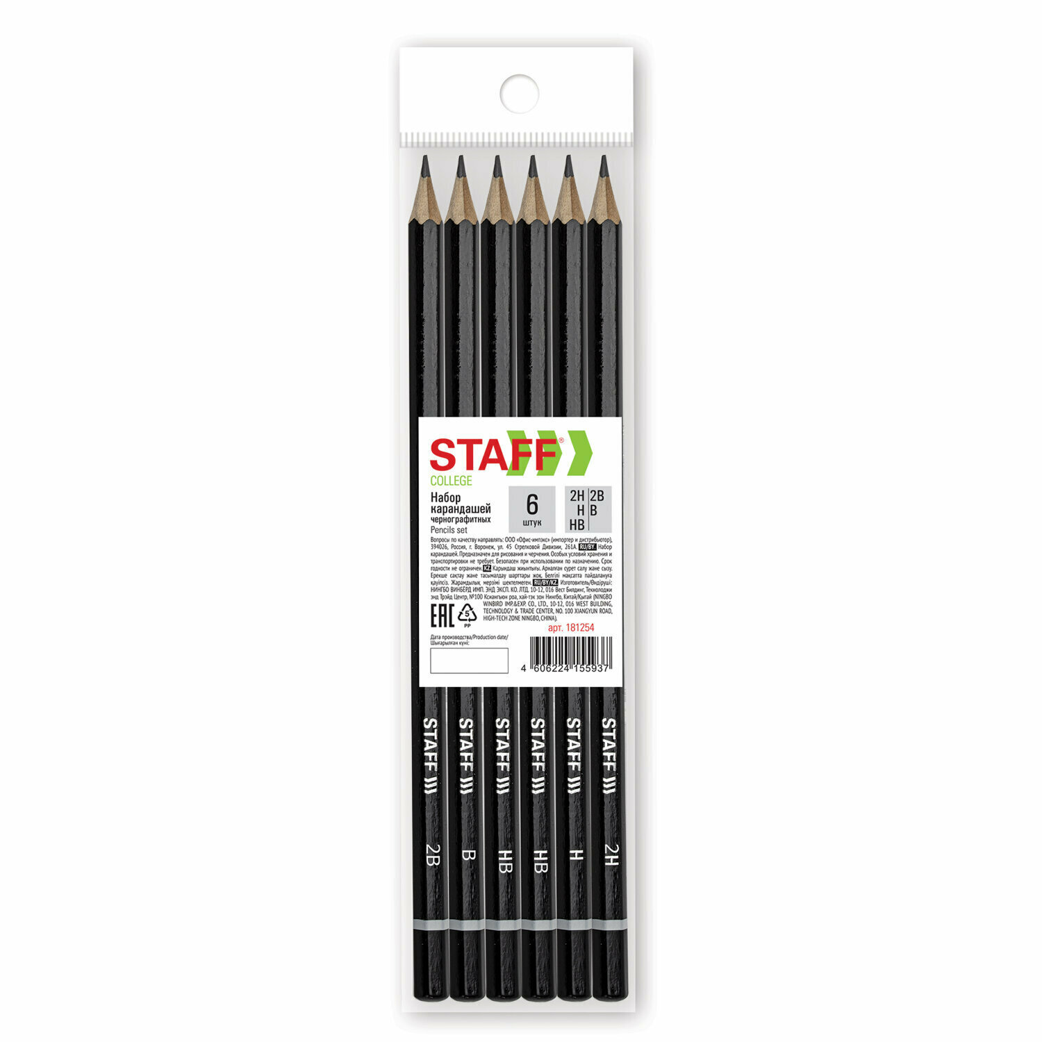 Карандаши чернографитные STAFF "College" BLP-254, набор 6 шт., 2H-2B, черный корпус, 181254