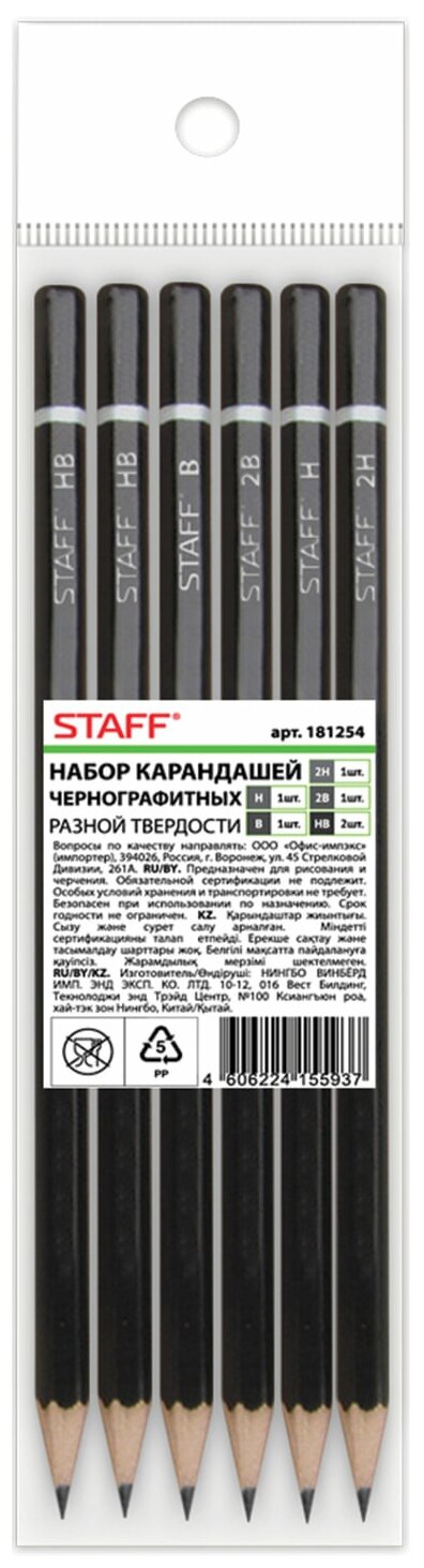 Карандаши чернографитные STAFF "College" BLP-254, набор 6 шт., 2H-2B, черный корпус, 181254 Комплект - 10 шт.