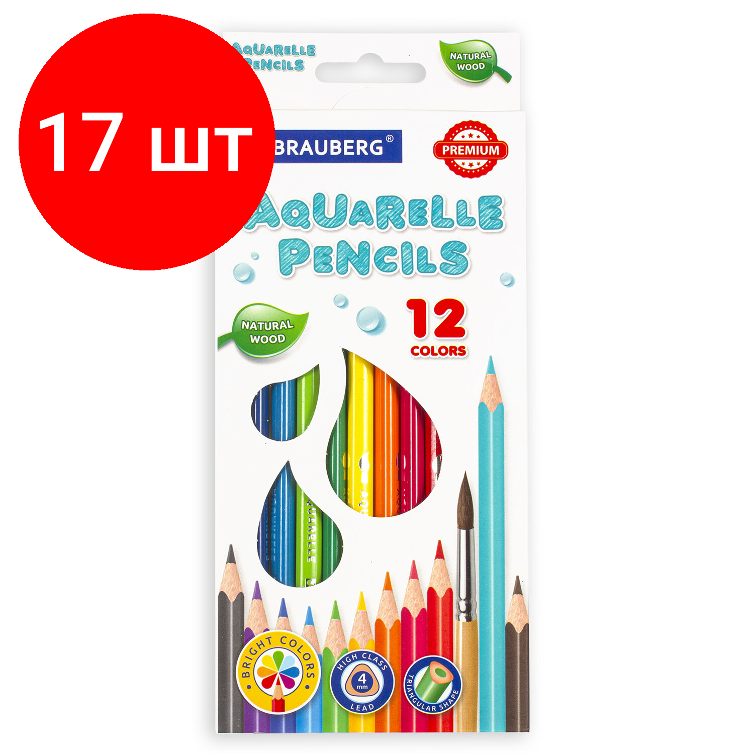 Купить Комплект 17 шт, Карандаши цветные акварельные BRAUBERG PREMIUM AQUARELLE, 12 цветов, грифель мягкий 4 мм, 181671
