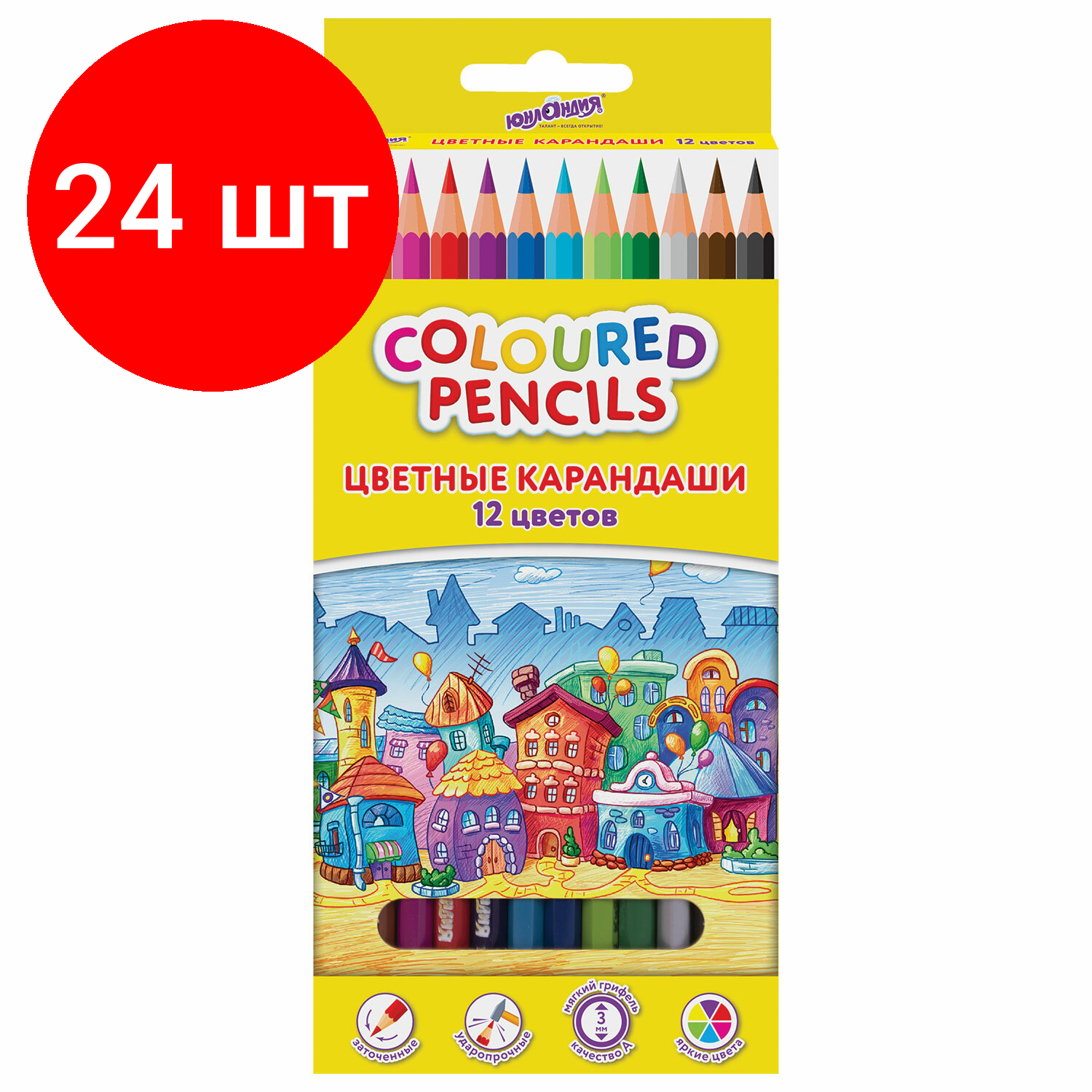 Купить Комплект 24 шт, Карандаши цветные юнландия "домики", 12 цветов, классические, грифель мягкий 3 мм, 181836